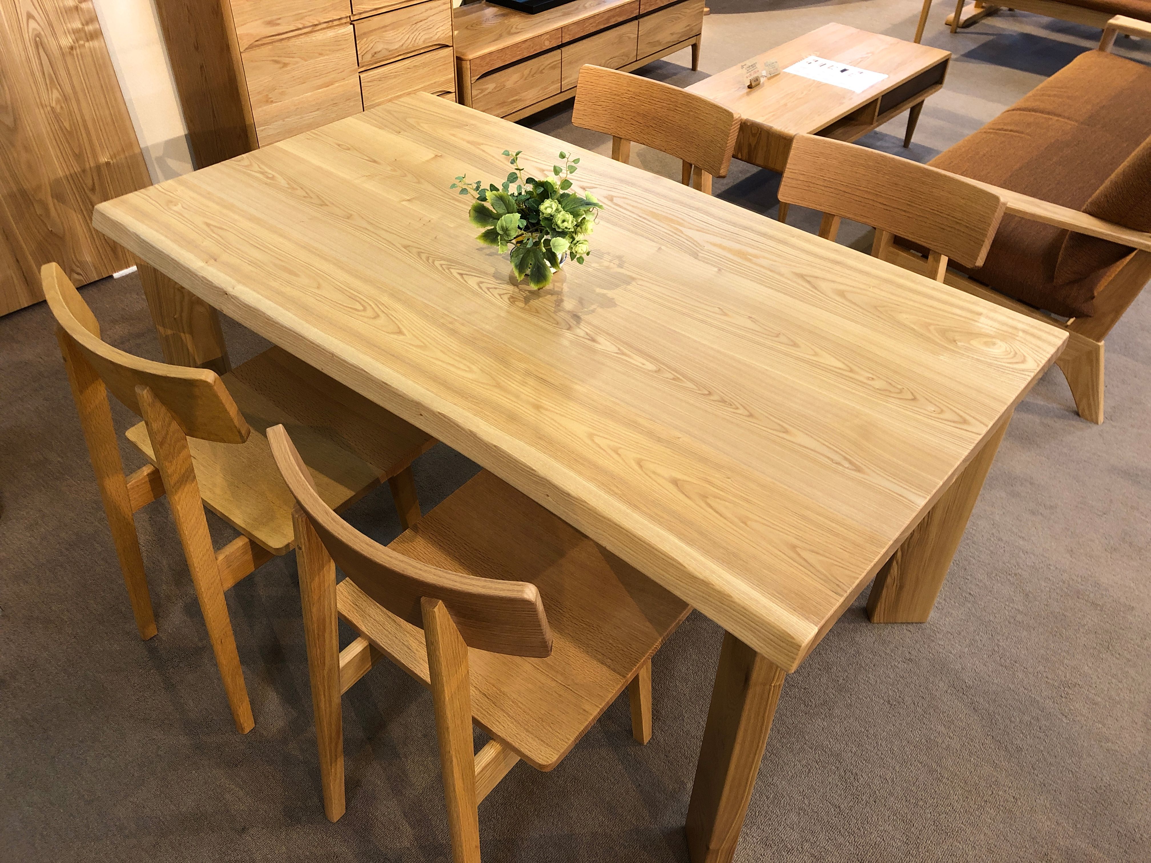 北米のスペリオル湖周辺で採れるアッシュ材(タモ材)の綺麗な木目を生かしたテーブルと、飛騨産業のクラフト感あふれるチェア4脚のセットです。